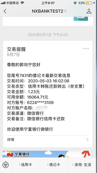 宁夏银行微信借记卡动账通知便捷上线!