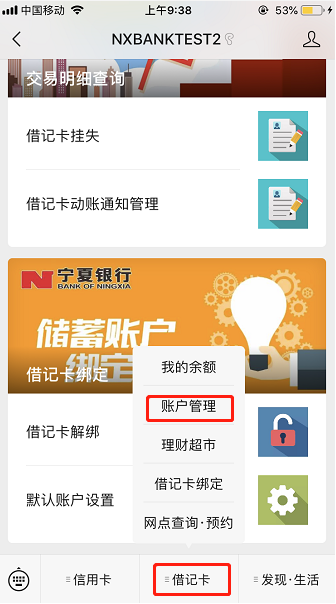已持卡客户,关注“宁夏银行微银行”公众号,点击底部菜单栏“借记卡”,选择账户管理;