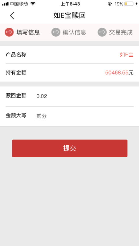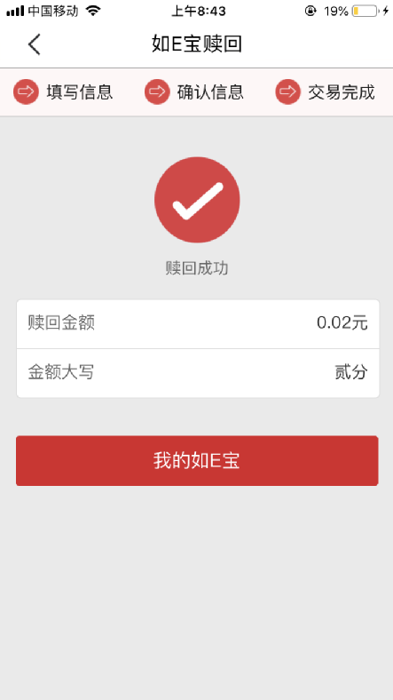 第五步:如有资金使用需求,可进入“如E宝”菜单,输入赎回金额,验证支付密码