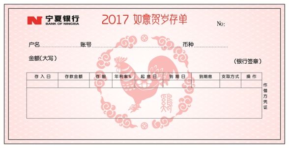 宁夏银行如意贺岁存单,采用中国传统剪纸工艺,将12生肖“酉鸡”“祥云”“如意”“钱币”等元素有机结合,体现中国非物质文化遗产工艺和活泼灵动的“酉鸡”形象,使贺岁存单在满足金融产品属性的基础上,通过艺术性、文化性、鉴赏性凸显宁夏银行如意贺岁主题的独特个性。存单整体版面印制精美,不仅展现春节吉祥如意、大吉大利、幸福团圆的祝福,更展现出一份存单对中国文化的传承和守护!